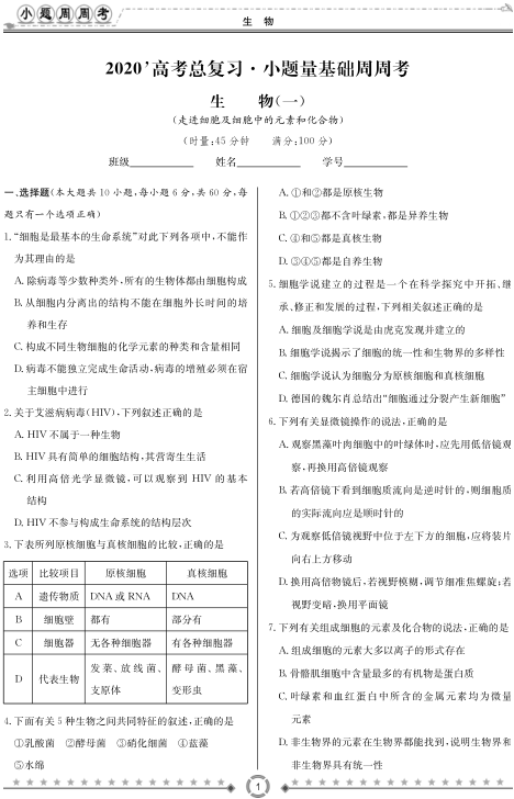 【小题周周考】2020届高考总复习小题量基础周周考-生物(pdf版,48套,含答案)